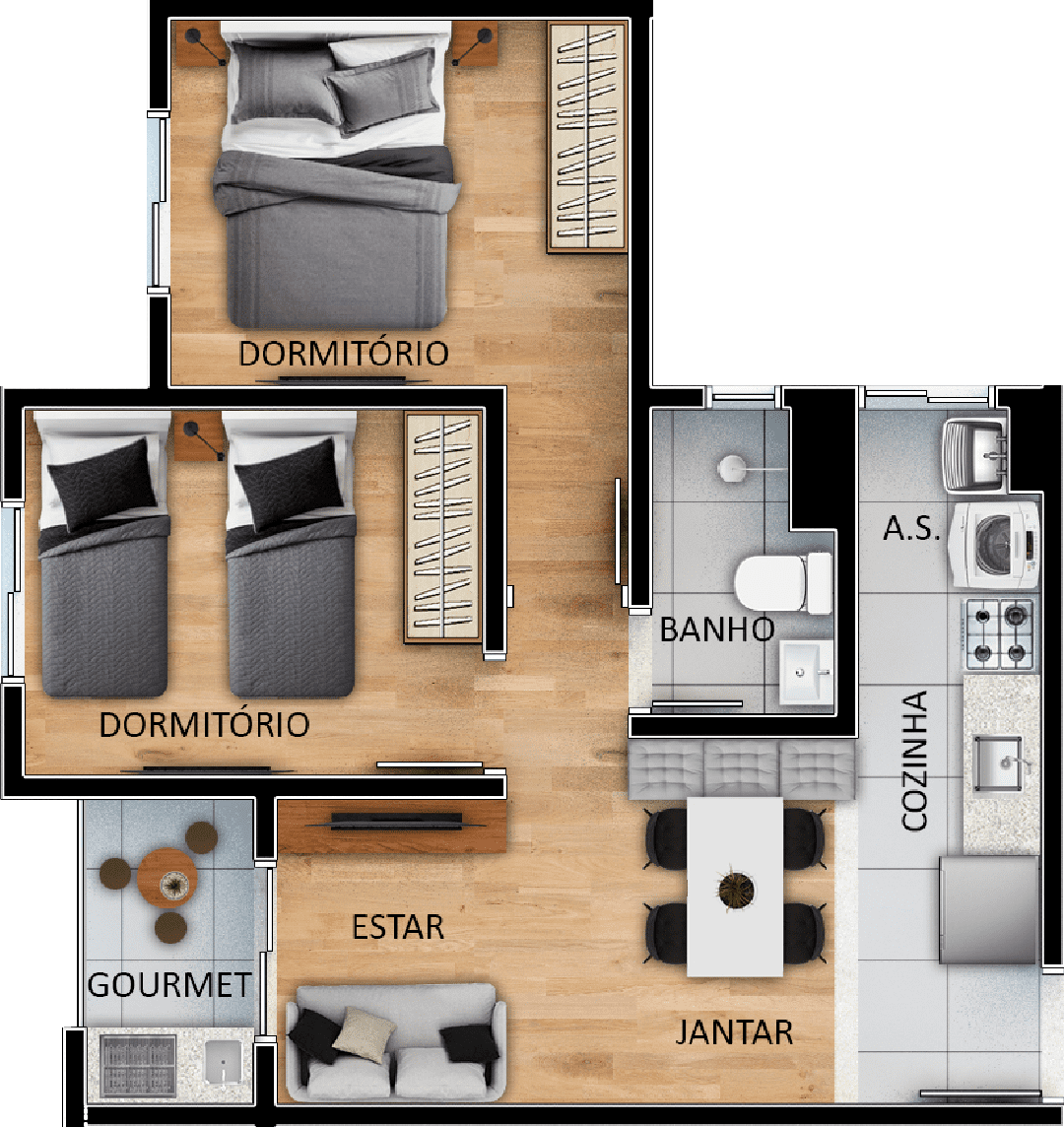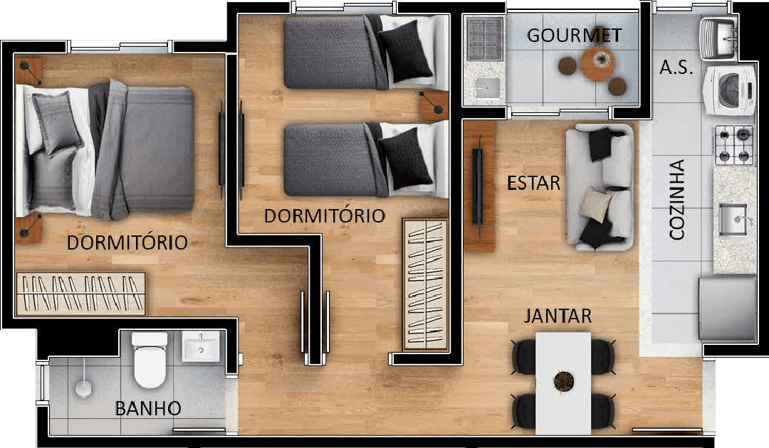 45 m², 2 dormitórios, varanda gourmet, cozinha, área de serviço, sala de estar e jantar e banheiro social